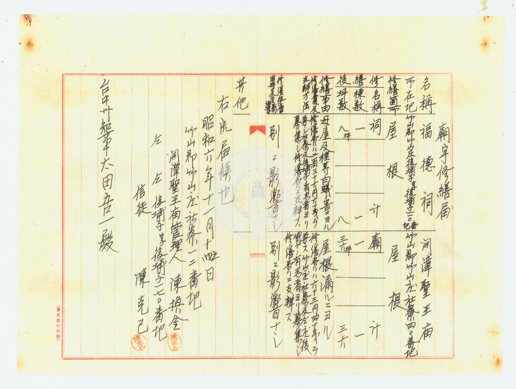 | 題名: | 昭和六年竹山郡竹山庄福德祠及開漳聖王廟廟宇修繕 |